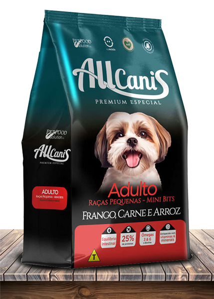 Ração PFS Allcanis Cães Adultos Raças Pequenas - Mini Bits Frango, Carne e Arroz